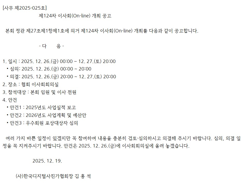 [사무국] 제124차 이사회(On-line) 개최 공고